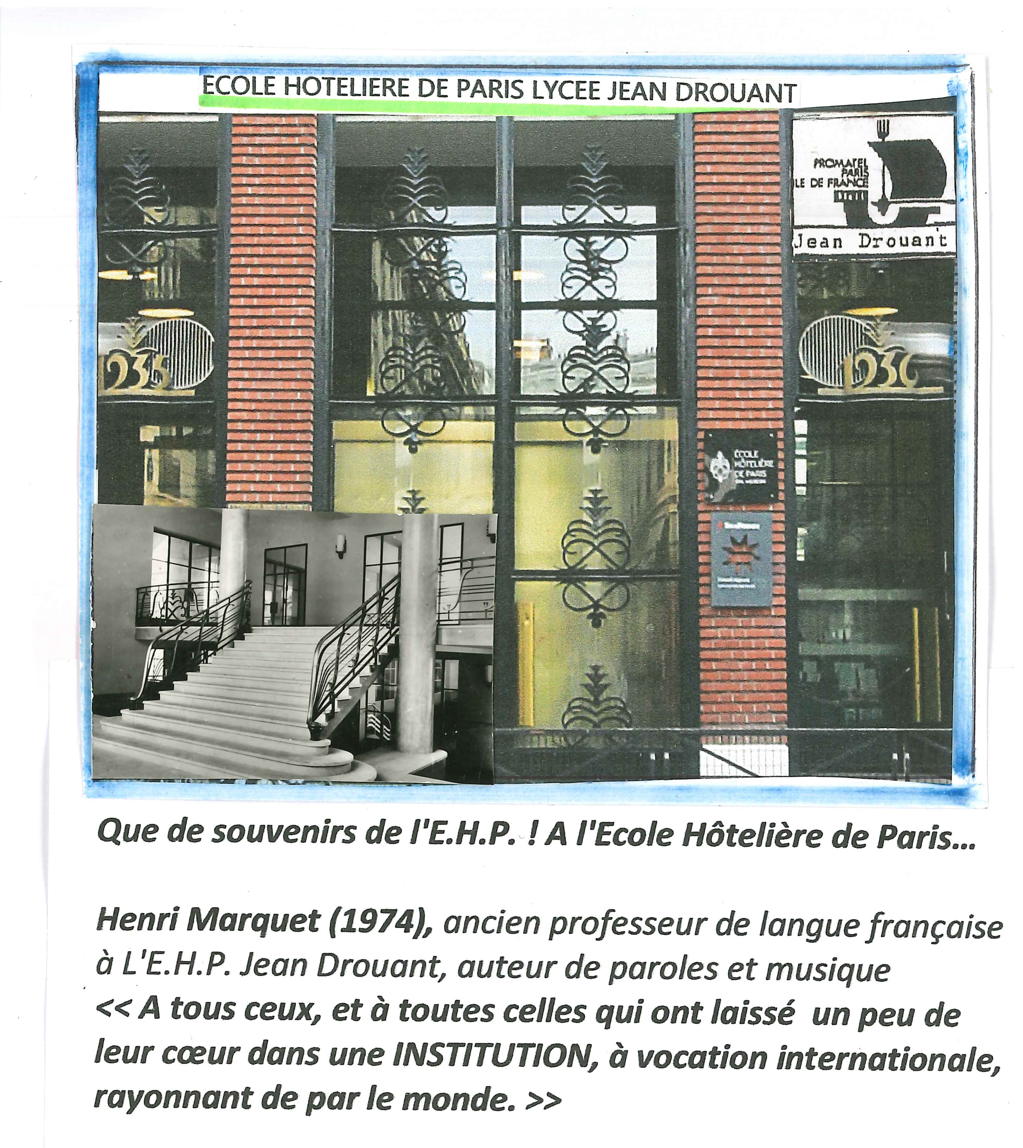 QUE DE SOUVENIRS DE L'E.H.P. JEAN DROUANT ! – Bars rentrées, Voyages d'études pro, Cycle de Diners-débats, Livres blancs & Mémorandums, Charte des parrainages des promotions…( avec à gauche photo Jean Drouant, et à droite l'illustration … LA REUSSITE – Deux citations d'actualité … << L'obstination est le chemin de la réussite – Charlie Chaplin (Ma vie); - << N'acceptez jamais la défaite, vous êtes peut-être à un pas de la réussite. >> - Jack E. Addington. ………. …….1952 ( 7 août), - Décret portant attribution de la dénomination << ECOLE HOTELIERE JEAN DROUANT >> à l'Ecole hôtelière de Paris. – 1958 - Création de la première section de << techniciens supérieurs >> en France; - 1974 – Célébration du 30e anniversaire de la création de l'association des AE ( 11 octobre 1944 par Mr. Roger Deschamps), avec remise officielle du diplôme d'honneur de l'association par Mr. Pierre Berthet, président du CA, à Mr. Jean Drouant, Mr. Julien François … à la Conciergerie à Paris …. Lire la suite...